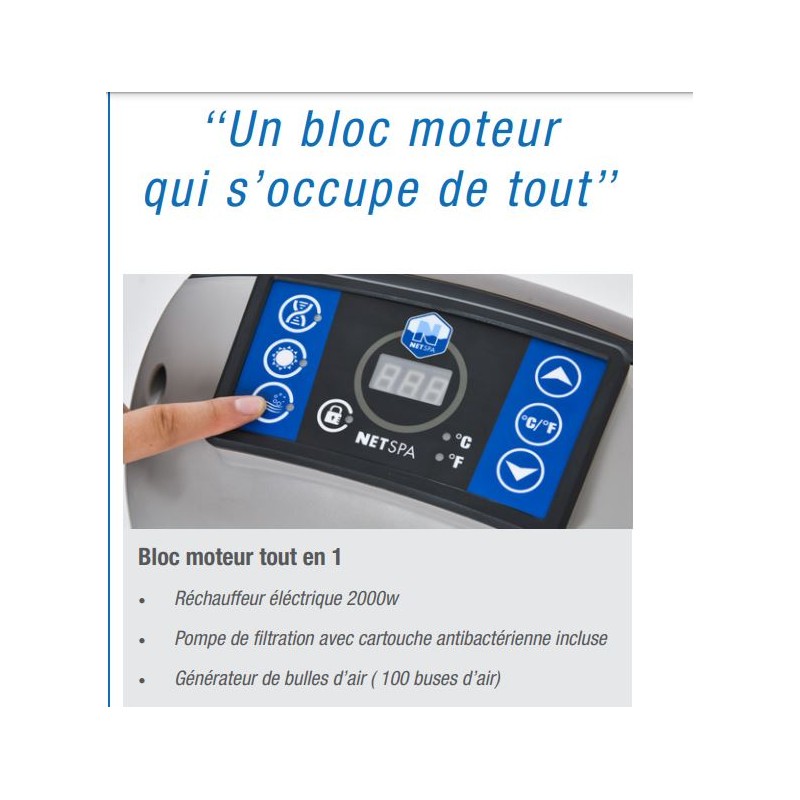 Sein intelligenter Motorblock Netspa sorgt für Heizung, Filtration, aber auch entspannende Blasen, für eine reduzierte Wartung und ein um das 10-prozentige Vergnügen.