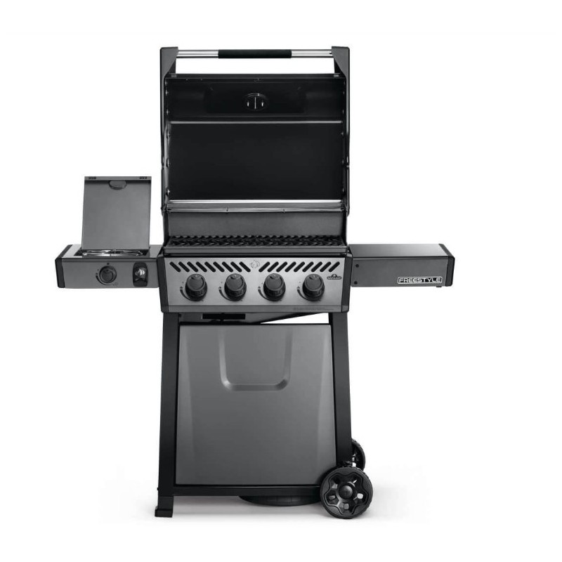 Der Napoleon Freestyle 425 Propangasgrill mit Seitenherd ist ein kompakter Grill mit emaillierten Gusseisenrosten, einer Zündung Jetfire und ein klappbares Seitenregal ermöglichen ein gleichmäßiges, einfaches und schnelles Garen.