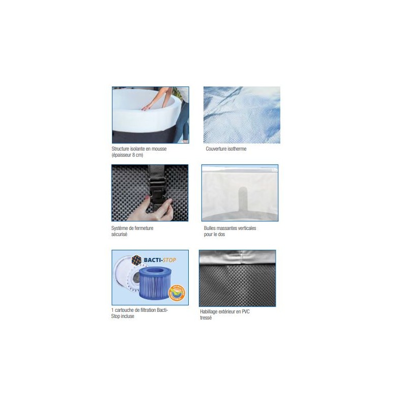 Seine 8 cm Schaumstruktur vereint mehrere Vorteile: schnelle Montage, höhere Steifigkeit im Vergleich zu einem aufblasbaren Spa und bessere Isolierung.