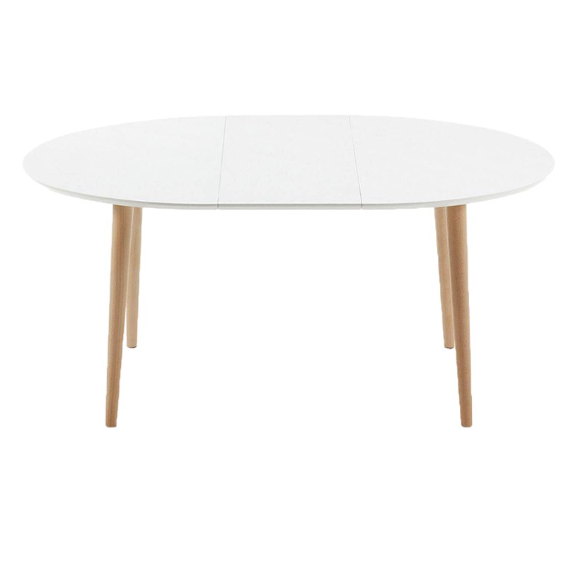 Ovaler ausziehbarer Tisch mit Tischplatte aus matt weiß lackiertem MDF. Füße aus lackiertem Buchen-Naturholz. Maximale Länge 200 cm. Kaufen Sie unsere Tasche für Tischverlängerungen und bewahren Sie sie auf, wenn Sie sie nicht brauchen!
