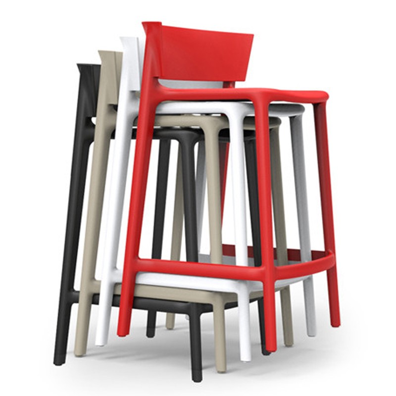 Namely: Stackable stool. Seat height: 64.5 cm. Indoor and outdoor use. The seat height 64.5 cm is recommended for a kitchen worktop 90cm high. Exists with a seating height of 74.5 cm, (recommended for a bar or a standing eat of height 110-115 cm). Please contact us.