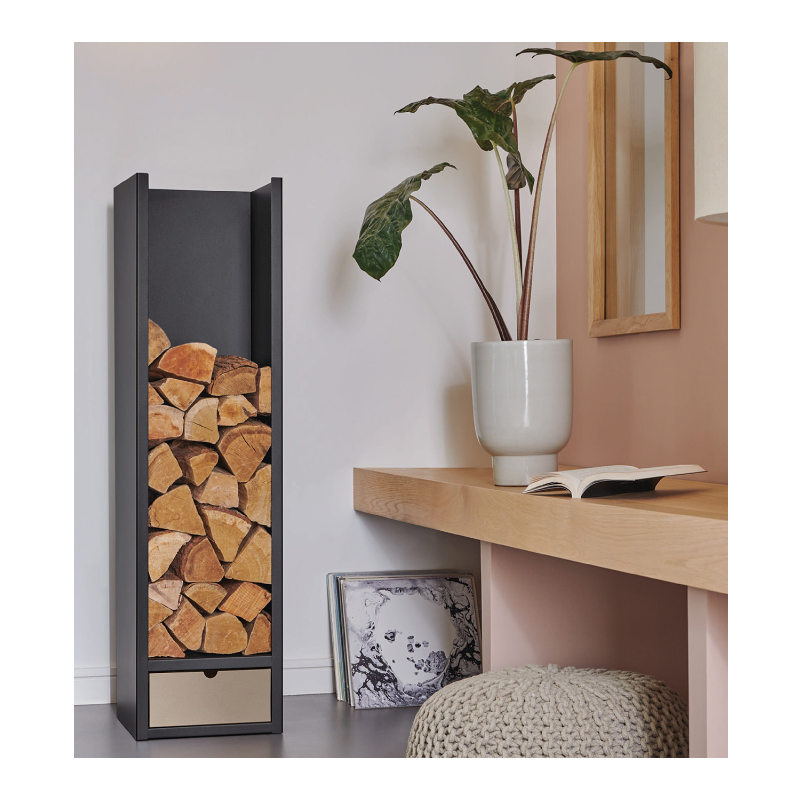 Its sandstone-coloured drawer conceals accessories for easy storage of small accessories: matches, fire starters, newspapers, or kindling.