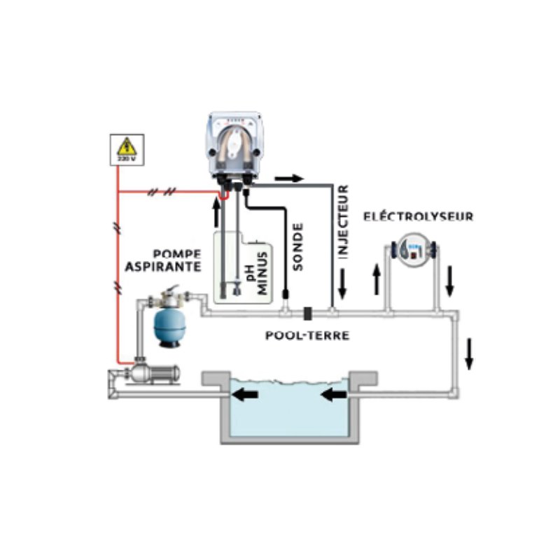 The pH sensor as well as the injection system must be positioned before the electrolyser. Place the pH probe close to a ground pool.