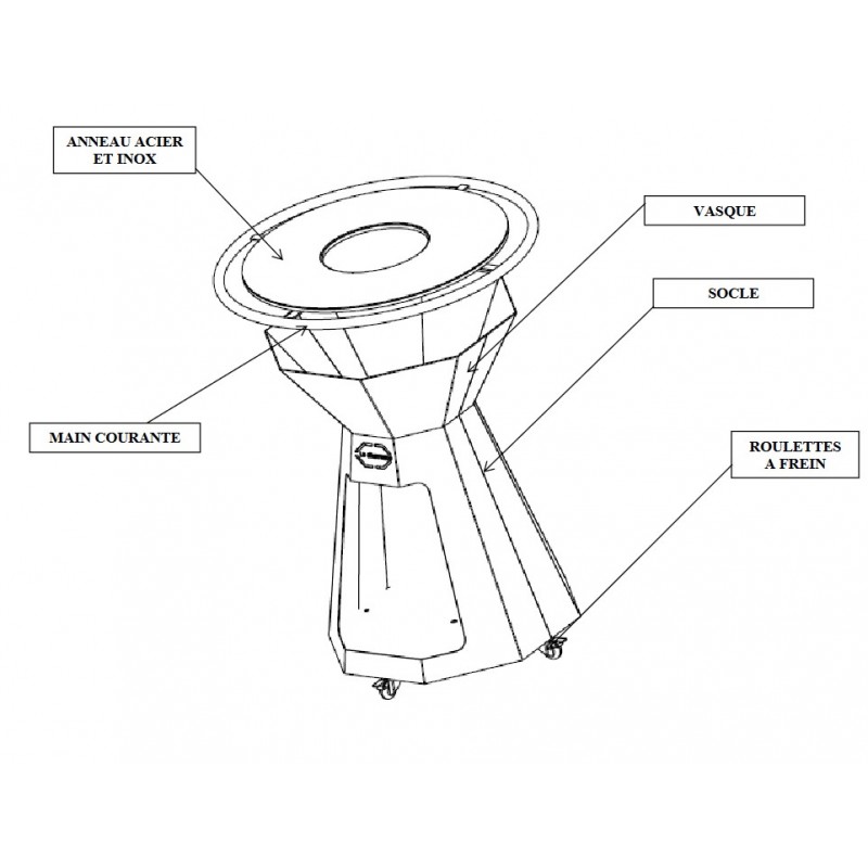 Brazier (base and basin) with the 4 mounted castors and the ring steel and stainless steel with handrail.