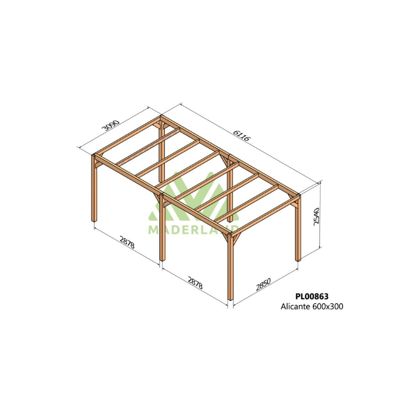 Alicante 600x300cm 18m2 freestanding pergola in raw wood.