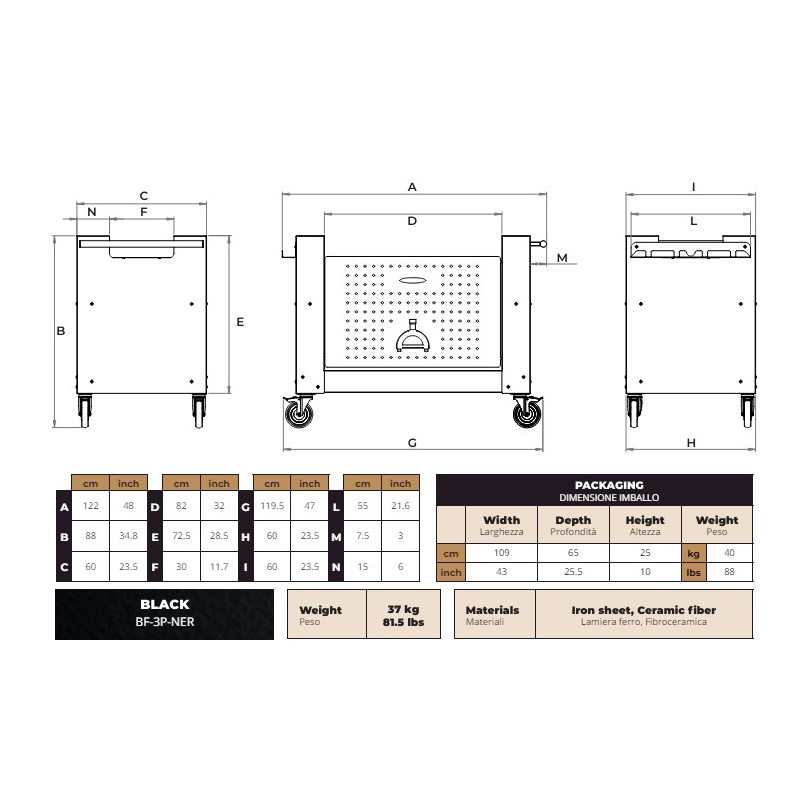 The Alfa Base Cart for Moderno 3 Pizza Oven Black Underbody on Wheels.
