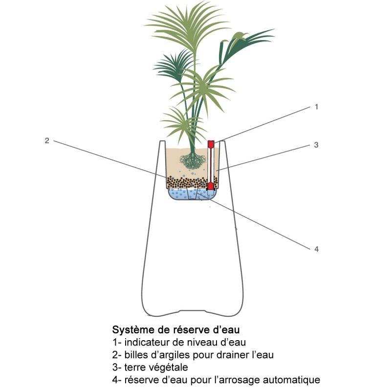 Namely: Model proposed with double wall Exists in 10 colors: white, black, bronze, light gray, anthracite, red, pistachio green, orange, pink, champagne (champagne color only available in lacquered finish). Also available in version with self-irrigation system (autonomy up to 3 months), glossy lacquered, bright, LED. Price on request Interior dimensions of the pots: - Large model: 62 x 57 x H 46 cm - Medium model: 43 x 39 x H 28 cm - Small model: 30 x 24 x H 14.2 cm.