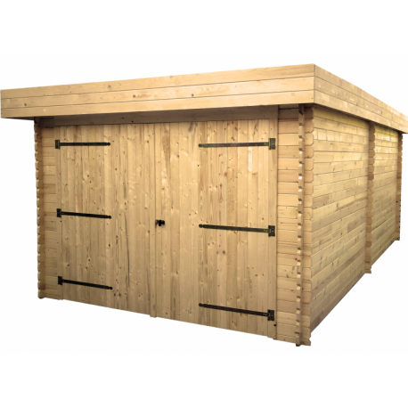 Garaje de madera maciza Habrita 21m2 con tablones 28mm y Techo plano con bandeja de acero Habrita.
