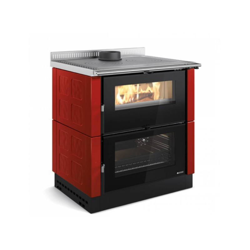 La cocina de leña Verona XXL con horno de 68 litros de La Nordica está fabricada en hierro fundido con revestimiento de loza blanca Infinity. Con una potencia nominal de 8kW que permite calentar unos 200m3. Amplia vista del fuego y troncos de hasta 30 cm.