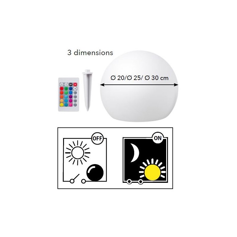 - Bola de luz flotante con energía solar (LLDPE) (batería de litio de 3.7V 1200MA; autonomía 8-10 h), iluminación multicolor (4 x LED RGB - 16 colores de luz fijos, 4 modos de cambio de color incluidos control remoto), multipropósito, IP68.
