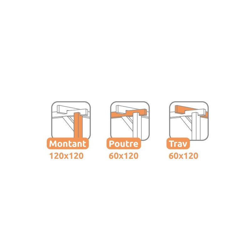 La pérgola incluye 4 postes verticales de sección 12 x 12, vigas portantes de 6 x 12 y 6 travesaños de 6 x 12 para una excelente resistencia.