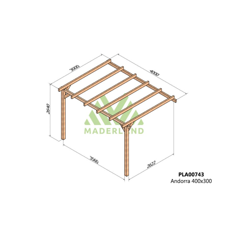 El pérgola Andorra Fabricado en madera laminada encolada en bruto fabricada por Maderland se va a adosar a la fachada de tu vivienda para disfrutar de una ampliación en la terraza o jardín.