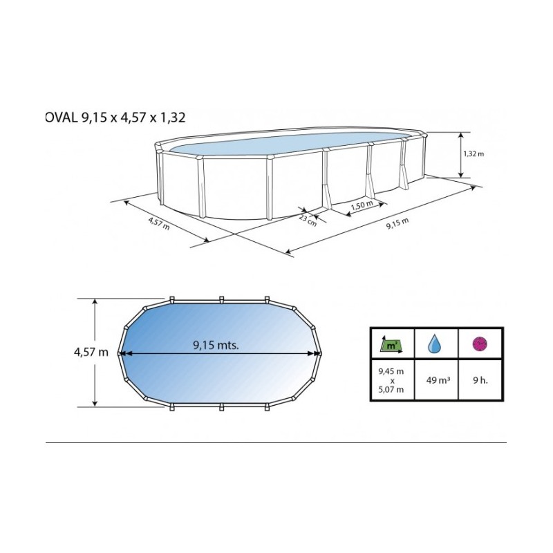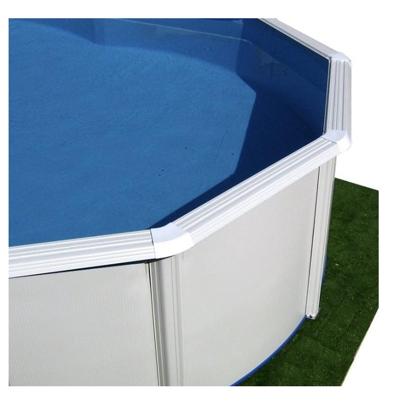 Piscina ovalada de 132 cm de altura sin contrafuertes. La piscina encaja perfectamente en su jardín. Estructura de acero con perfiles metálicos y skimmer completo.
