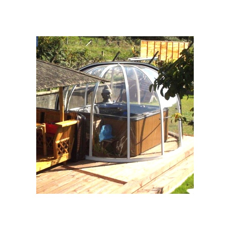 El modelo de corredera redonda Sfero El diseño en forma de cúpula está disponible en cuatro tamaños, especialmente diseñados para cubrir spas y ampliar su espacio de vida al aire libre, con el fin de estar libre de limitaciones climáticas, pero no solo.