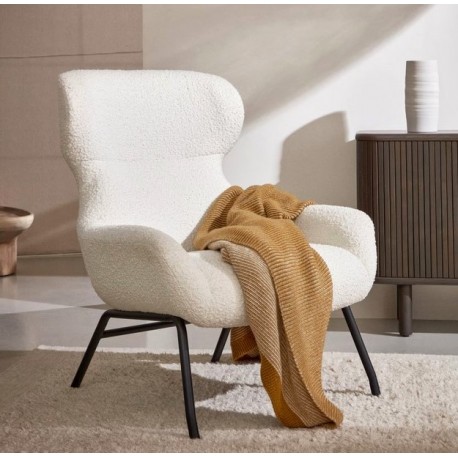 El sillón Lina es la combinación perfecta de confort y diseño, gracias a su tapicería de rizo y patas de acero con acabado en negro.