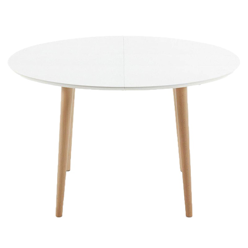 Mesa extensible ovalada con mesa superior en MDF lacado en blanco mate. Pies de madera de haya natural barnizada. Longitud máxima 200 cm. ¡Compre nuestra bolsa para extensiones de mesa y guárdalas cuando no las necesite!