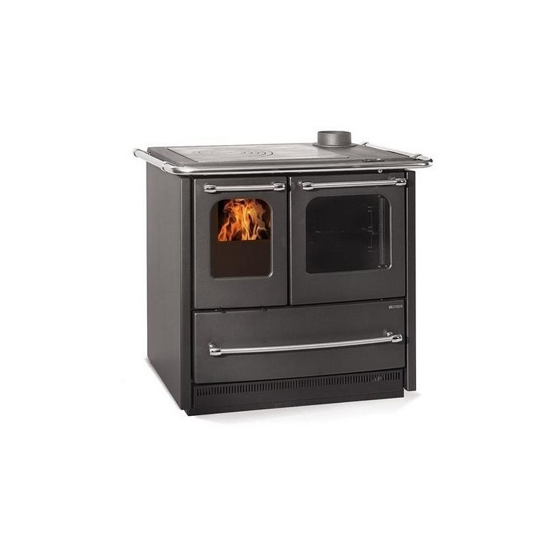 La cuisinière a bois Sovrana Easy Evo avec four de 41 litres de la marque La Nordica est en fonte émaillée Noire . D'une puissance nominale de 7.2kW ce qui permet de chauffer environ 215m3. La cuisinière à bois en fonte utilise des bûches de bois jusqu'à 30 cm.