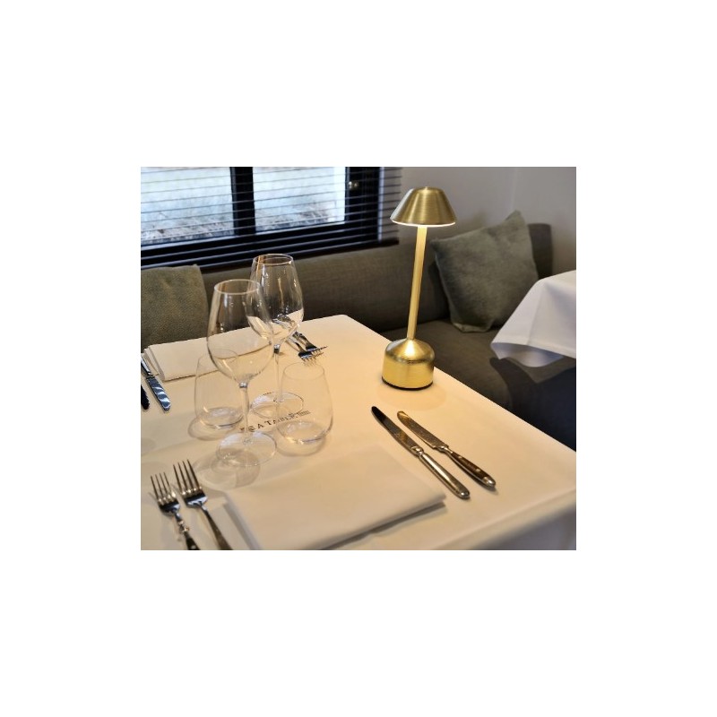 Lampe d'intérieur/extérieur LED disponible en version haute rechargeable de la collection Demoiselle éditée par Imagilights, composée d'une structure en aluminium ionisé brossé et d'un abat-jour Conique agrémenté d'un diffuseur.
