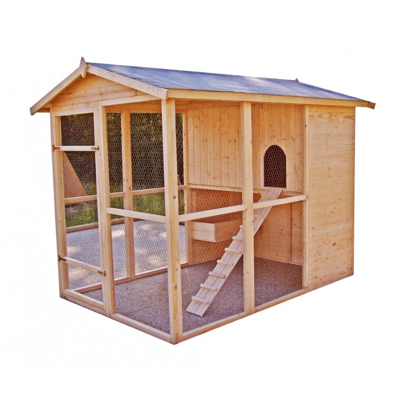 Equipé d’une volière, d’un espace nuit fermé ainsi qu’un pondoir à l’intérieur.