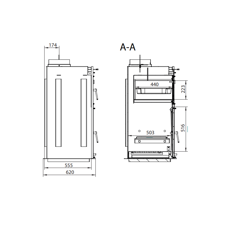 Forno a focolare da interno: 223x593x440 (altezza, lunghezza, profondità)