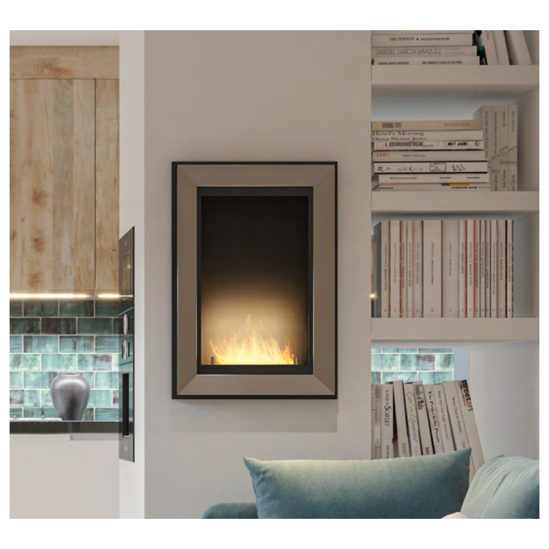 Il camino a bioetanolo senza condotto Frame 550 con 1 lastra di vetro può essere installato sospeso o incassato a parete.
