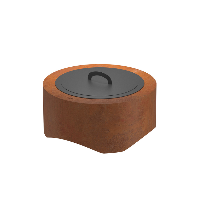 O conjunto inclui o braseiro de aço Corten, a pastilha de caixa de fogo de aço de 3 mm de espessura pintada com uma tinta especial à prova de fogo em preto e a tampa preta.