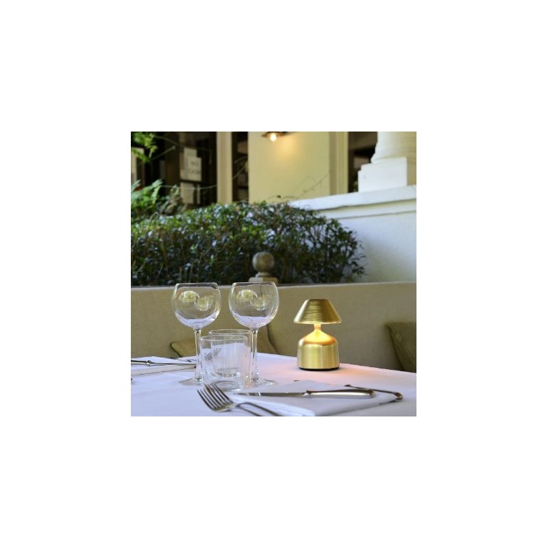 Lâmpada LED para interiores/exteriores disponível numa versão alta recarregável da coleção Demoiselle publicada pela Imagilights, composta por uma estrutura de alumínio ionizado escovado e um abajur cónico decorado com um difusor Sable.