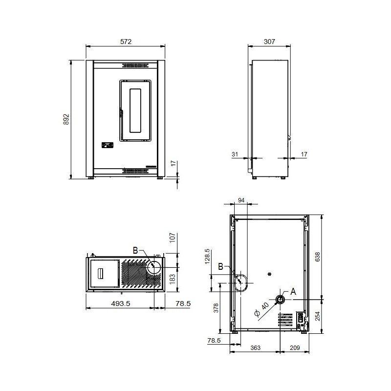 Características técnicas do fogão a pellets ventilado Luisella 4,8 kW: