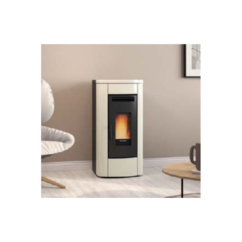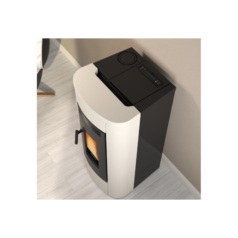 O fogão a pellets ventilado Klaudia La Nordica Extraflame tem uma potência nominal de 8kW que pode aquecer até 230m3 com controle semanal programável e remoto. O fogão a lenha tem capacidade para 15kg de pellets.