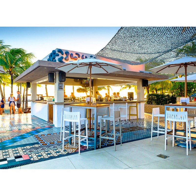 Composto por dois banquinhos altos e uma mesa alta, o conjunto de mesa Spritz e dois banquinhos nos lembram as cercas de madeira branca que alinham a praia.