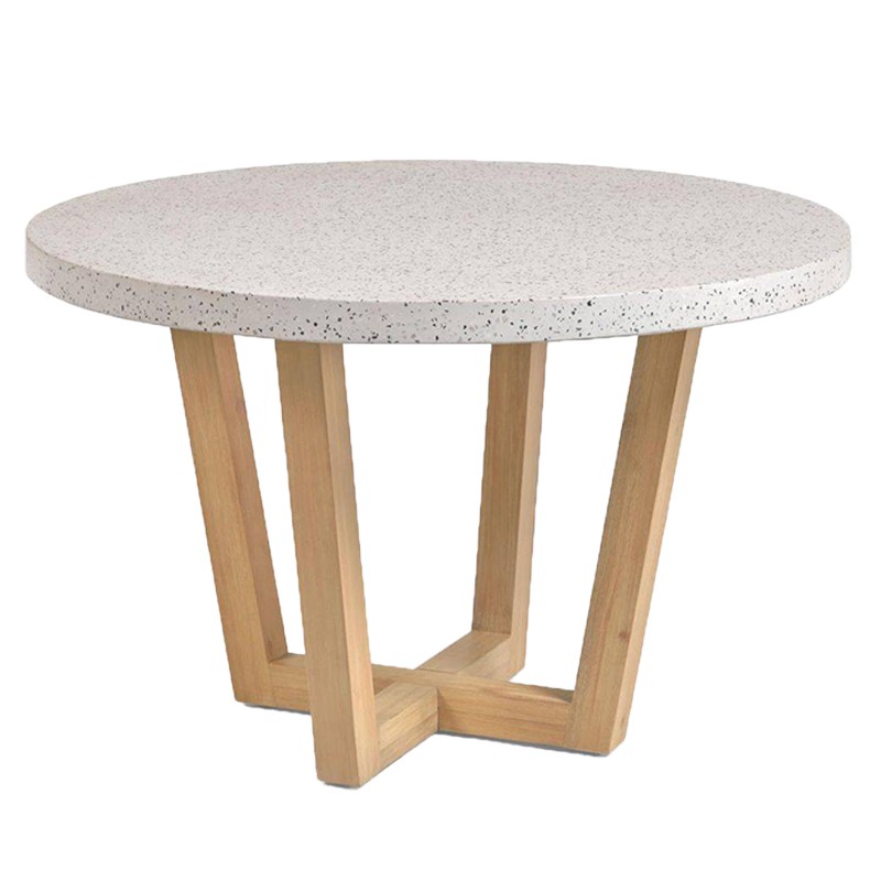 Mesa redonda com topo de terrazzo branco Ø 120 cm e estrutura de madeira de acácia sólida.